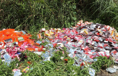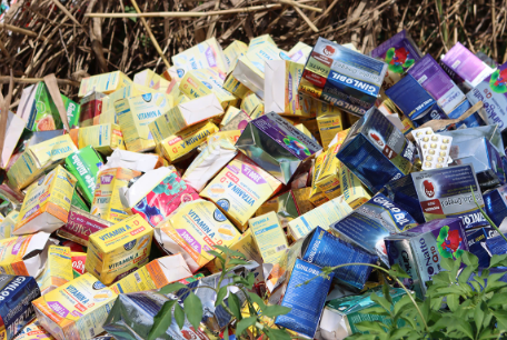 Trước đó, người dân phát hiện hàng loạt thùng carton chứa các sản phẩm là thuốc và thực phẩm chức năng vứt bừa bãi giữa bãi cỏ hoang. Nghi ngờ có hành vi bất thường, người dân đã báo chính quyền địa phương. Qua kiểm tra, lực lượng chức năng ghi nhận có ít nhất năm điểm đổ bỏ, mỗi điểm cách nhau từ 3 đến 20 mét, mỗi đống hàng ước tính nặng từ 30-50 kg.