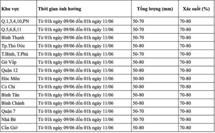 Dự báo chi tiết tổng lượng mưa, xác suất mưa cho từng khu vực ở TPHCM từ 1 giờ ngày 9/6 đến 1 giờ ngày 11/6. Nguồn: Đài Khí tượng Thủy văn khu vực Nam Bộ và Tây Nguyên